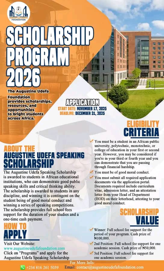 With financial barriers removed and a platform to showcase real intellectual skill, the Augustine Udefa Speaking Scholarship stands ready to spotlight Africa’s next generation of powerful communicators and ethical leaders.