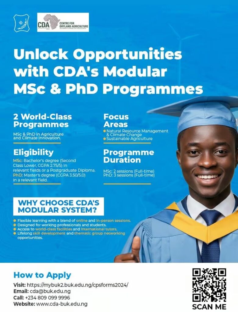 As the world faces increasing environmental challenges, BUK’s CDA offers practical postgraduate courses designed to equip students with the knowledge and skills to make real impacts in agriculture and environmental management. These programmes are ideal for individuals eager to advance their careers while contributing solutions to urgent agricultural and climate problems.
