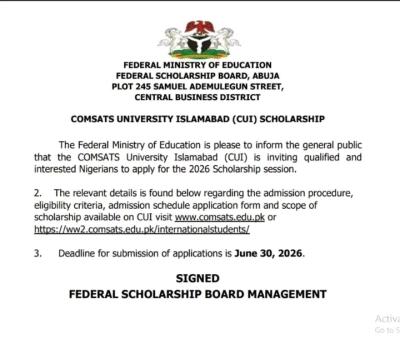The Federal Ministry of Education, through the Federal Scholarship Board, has officially announced the opening of applications for the 2026...