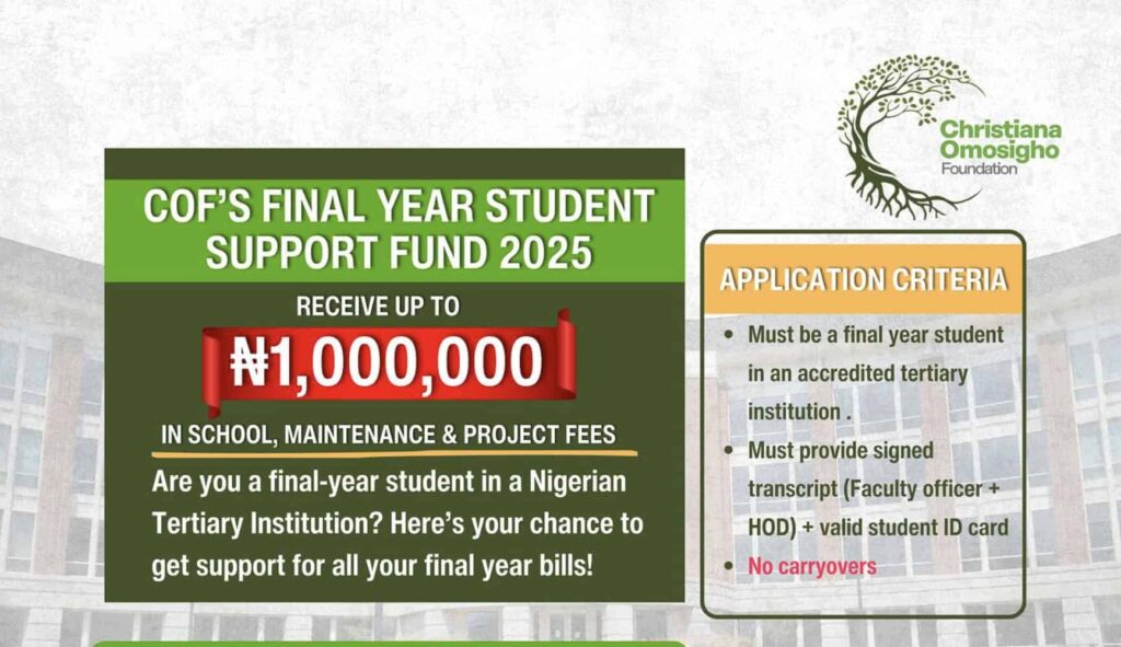 For more information, students are encouraged to visit the official Christiana Omosigho Foundation social media pages for application details and updates.