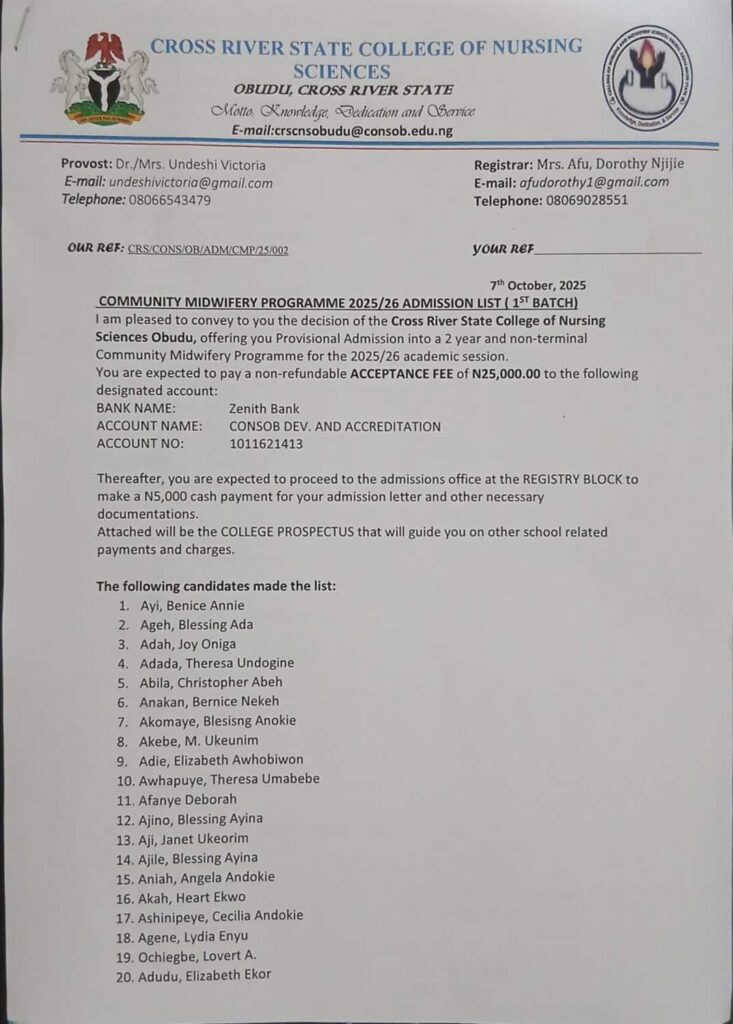 OBUDU, Cross River State — The management of the College of Nursing Sciences, Obudu has officially announced the release of the Community Midwifery Programme Admission List for the 2025/2026 academic session. This marks an exciting milestone for applicants who recently participated in the college’s screening exercise.