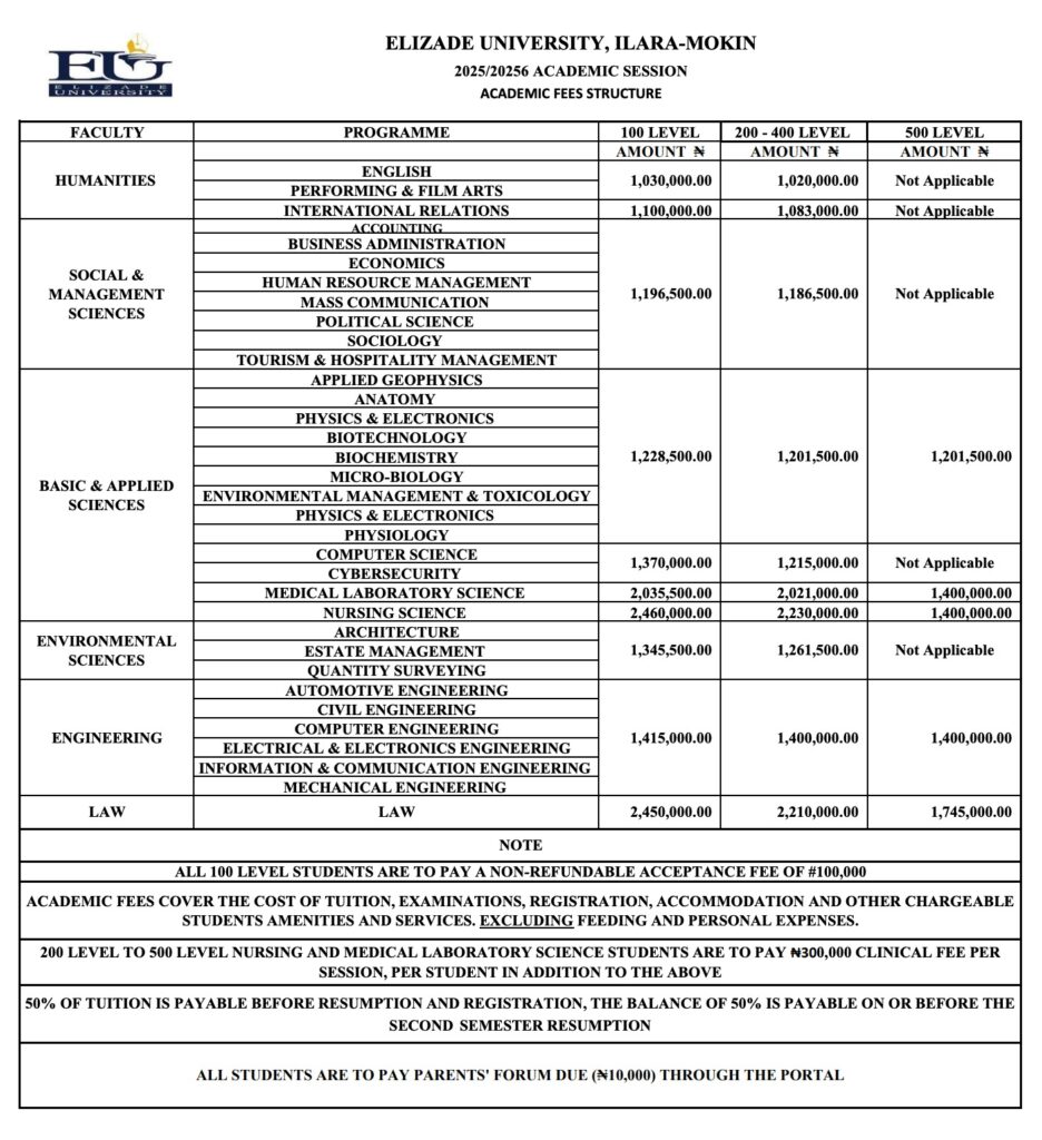 If you’re unsure about your specific fee or course category, contact your department directly or visit the  Elizade University official site for updates and clarifications.