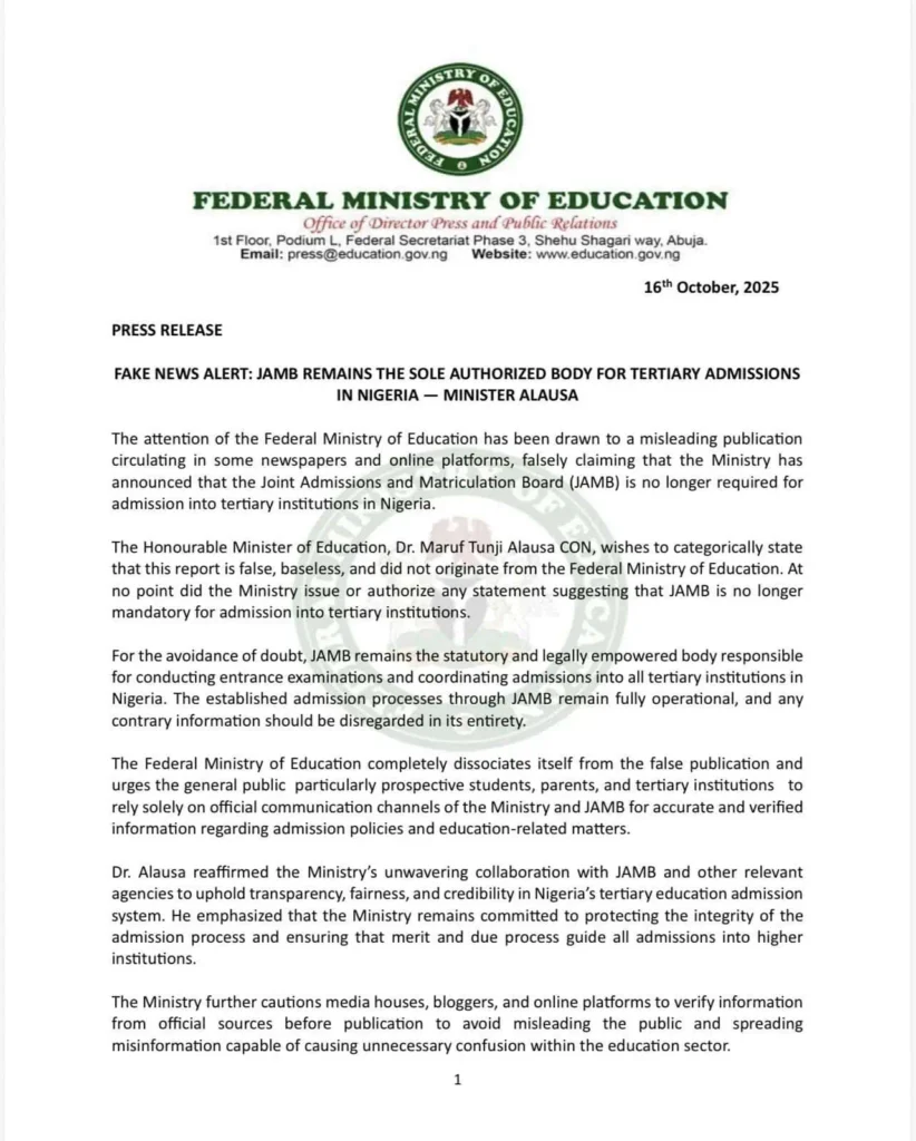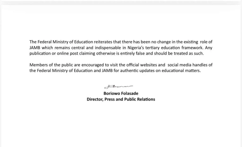 The Federal Ministry of Education has firmly dismissed a false report circulating in newspapers and across social media claiming that the Joint Admissions and Matriculation Board (JAMB) is no longer required for admission into tertiary institutions in Nigeria.