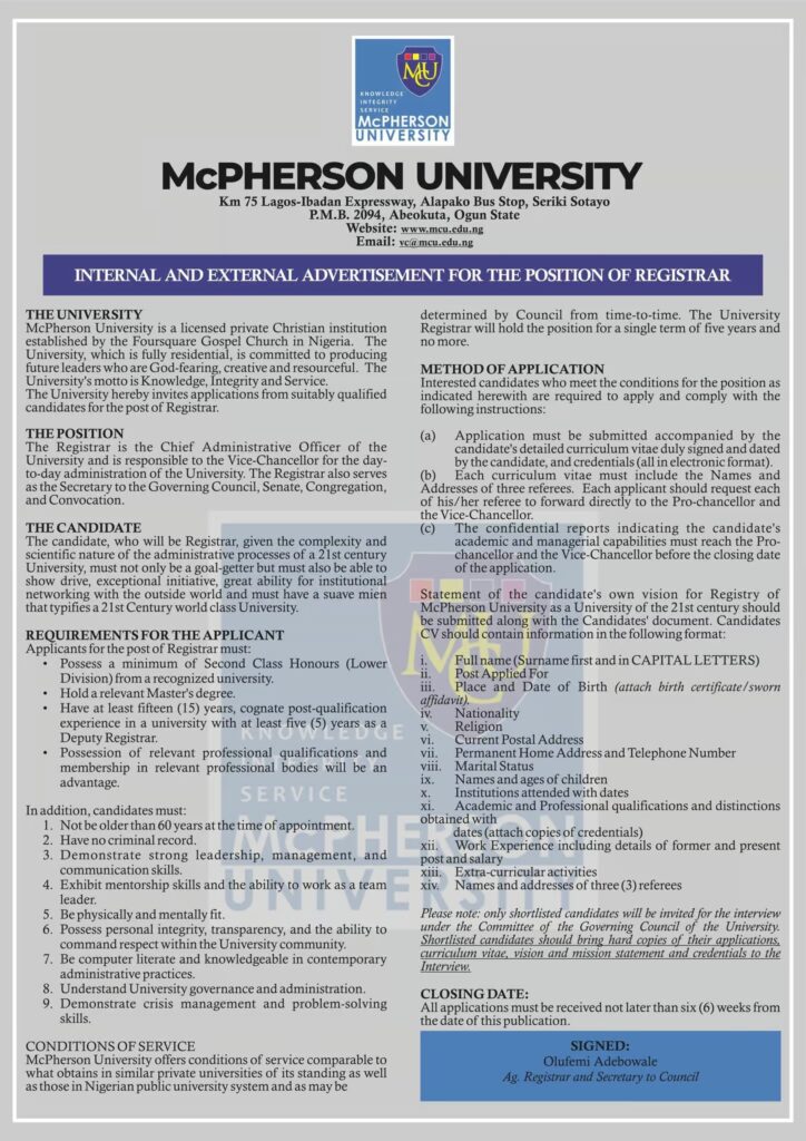 McPherson University, owned by the Foursquare Gospel Church in Nigeria, is a fully residential university built on the values of Knowledge, Integrity, and Service. The university is seeking a qualified professional to serve as Registrar, the highest-ranking administrative officer in the institution.