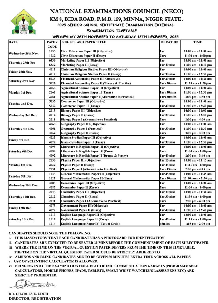 The National Examinations Council (NECO) has officially released the full timetable for the 2025 November/December General Certificate Examination (GCE). According to NECO, this year’s external exams will run from Wednesday, November 26 to Saturday, December 13, 2025.