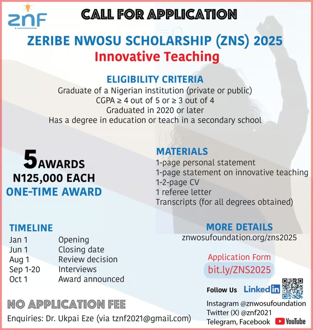 The Zeribe Nwosu Scholarships (ZNS) are now open for the 2025 application cycle, offering Nigerian teachers and education graduates a chance to sharpen their skills and advance their careers — for free.