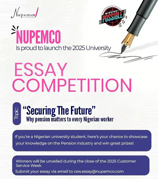Deadlines move fast — and so does opportunity. If you have a strong perspective on why pensions matter to Nigerian workers, this is your chance to share it with the world. NUPEMCO is not just rewarding winners with money and gadgets, but also offering students a platform to voice their ideas on a critical national issue.