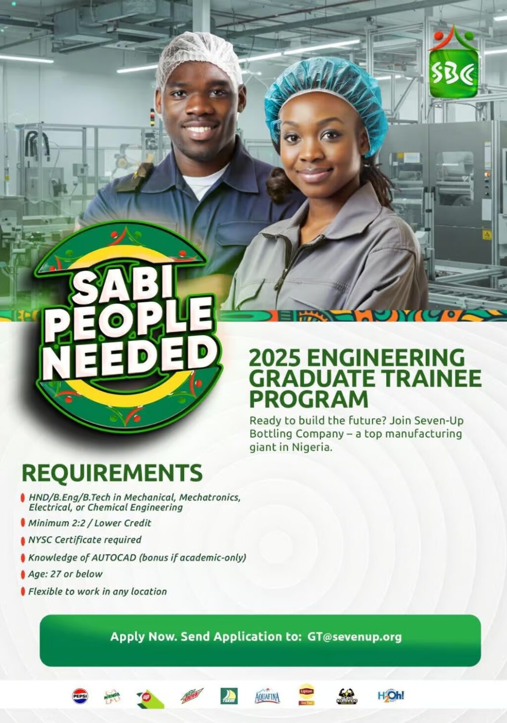 Are you a recent engineering graduate eager to kickstart your career in Nigeria’s fast-paced consumer goods industry? The Seven-Up Bottling Company, makers of popular drinks like Pepsi, 7Up, and Aquafina, is now accepting applications for its 2025 Graduate Engineering Trainee Programme.