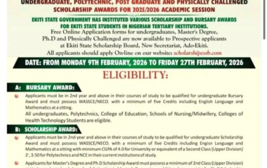 The Ekiti State Scholarship Board has officially opened its 2025/2026 Scholarship and Bursary Award applications for qualified Ekiti State indigenes...