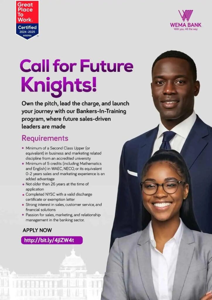 Are you a young graduate passionate about banking, technology, or sales? Wema Bank is giving you the chance to launch your career with its prestigious 2025 Bankers in Training (BIT) Programme.