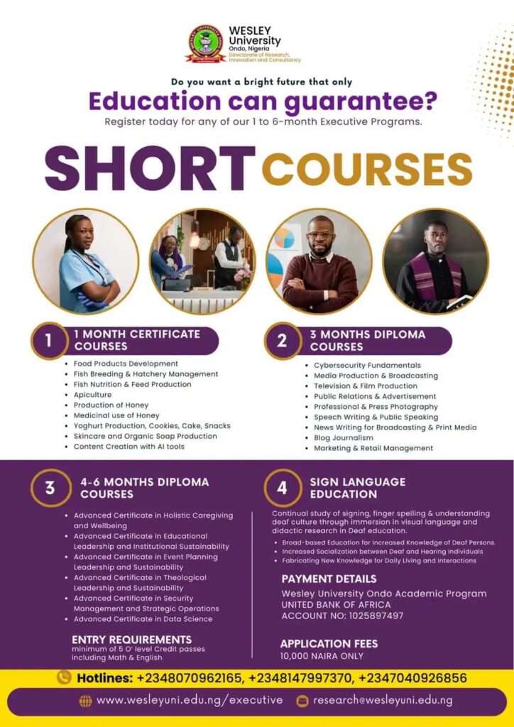 Wesley University in Ondo has launched a range of fast-track skills programmes designed to help Nigerians gain hands-on experience without spending years in school. Whether you’re fresh out of secondary school or looking to sharpen your skills for the job market, these short courses offer a practical and affordable solution
